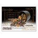 El diseño de la cubierta está adornado con trozos de chocolate y almendras derramadas desde un ramekin negro con un fondo horizontal en blanco y negro y un bloque de texto de las palabras chocolate, chocolate negro y almendras en inglés, alemán y francés, además de más palabras en una variedad de estilos de fuente, tamaños y colores. Personalizar el saludo interno con el mensaje o quita el texto.