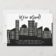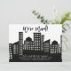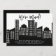 Moderna invitación para un nuevo apartamento con un paisaje urbano con edificios de apartamentos.