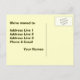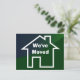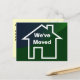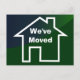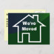 Un dibujo esquemático de una casa en líneas blancas sobre un fondo verde oscuro. Presenta el texto "Nos hemos mudado".