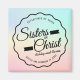 Diseño de emblemas cristianos audaces y elegantes con palabras, "Hermanas en Cristo" en escritura con elementos de diseño de pancartas. El centro superior del emblema tiene palabras, "Establecido por la gracia". El centro inferior del emblema del diseño contiene palabras, "arraigadas y arraigadas en Jesús". Emblem es negro sobre un bonito fondo pastel. Área para tus nombres personalizados (nombres de amigos) bajo la palabra "Cristo". Gran regalo para cualquier hermana cristiana.