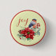 Un pájaro bonito, gris y blanco ha aterrizado en un grupo de poinsettias, pinecones, botánicos, bayas rojas y bayas blancas. Los copos de nieve están revoloteando y la palabra alegría está en un guión rojo al lado del pájaro.