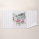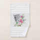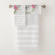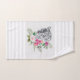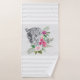 Toalla con un bonito ilustracion con un retrato de leopardo gris, negro y blanco. Este encantador animal está rodeado por un ramo de flores tropicales. Elegante, exótico y encantador. Rodeado de elegantes rayas grises.