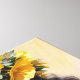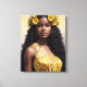 La huella de lienzo muestra el arte digital de una preciosa mujer negra de piel oscura con corona amarilla floral en su largo cabello ondulado, usando un elegante vestido amarillo con detalles florales. Retrato rico en melanina de Dee Claire. Vibes de verano.
