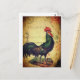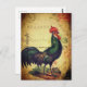 Diseño de época con un impresionante gallo azul verde y bonitas rosas rosas rosas, con texto en inglés y francés.