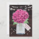 Dulce tarjeta rústica de cumpleaños floral rosa con hortensias rosadas y aliento de bebé dentro de un frasco de albañil contra un fondo rústico de madera. Luces de cuerdas y estrellas brillantes añaden un encanto mágico a este bonito diseño floral. Una etiqueta floral con el texto personalizado de "Feliz Cumpleaños" en la parte delantera y un gran corazón floral con un mensaje en la parte posterior.