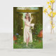 Hermosa tarjeta de felicitación en todo momento con productos lácteos con un vestido amarillo pálido en los bosques encantados Derechos de autor de los vendedores de Angélica