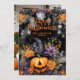 Foto de la tarjeta Happy Halloween con una calabaza sonriente usando un gorra negro de brujas y flores moradas y naranjas. Personaliza fácilmente esta tarjeta de Halloween con tu foto y el nombre de la familia.