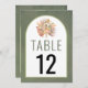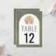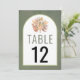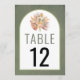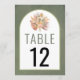 Hojas de palma secas tropicales, pasto pampas y flores de protea arco verde número de mesa boda. Este diseño de boda bonito presenta un marco de arco sobre fondo verde manchado. En el marco, un ramo de hojas de palma secas, flores de protea y pasto de pampas.
