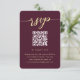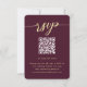 Esta elegante tarjeta de respuesta de bodas incluye un lugar para su código QR para que los huéspedes puedan desplazarse fácilmente por su sitio web boda. El frontal presenta un diseño sencillo y limpio con una tipografía de escritura moderna y un fondo de marsala de color burdeos. La parte trasera es una hermosa bayeta botánica y la huella verde de las vacaciones, perfecta para Navidades o bodas de invierno.