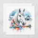 Tarjeta de Navidad personalizada. Hermoso caballo blanco de acuarela detrás de una cerca rústica con un granero en el fondo en un día invernal nevado.