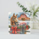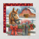 Tarjeta de Navidades personalizada en un tema agrícola. Caballo marrón bonito detrás de una antigua valla rústica de madera adornada con arcos, guirnaldas y luces de Navidad. En el fondo hay un granero rojo.