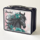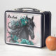 Hermoso caballo negro con flores verde azuladas y caja de almuerzo de fondo rosa bonito, edite el nombre usted mismo cuando usted pide. La misma imagen en la parte delantera y trasera.
