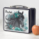Hermoso caballo negro con flores verde azuladas caja de almuerzo, edite el nombre usted mismo cuando usted pide. La misma imagen en la parte delantera y trasera.