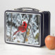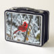 Este es un bello cardenal rojo brillante en la caja de almuerzo Metalizado de nieve