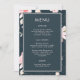El precioso menú boda clásico con motivos florales y carnosos presenta un delicado patrón botánico de flores rosas rubias y un fondo azul oscuro.