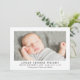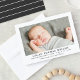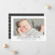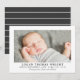 Anuncio de nacimiento con foto clásico y atractivo que presenta una foto enmarcada en un fondo blanco crujiente con el nombre del bebé en letras mayúsculas espaciadas y elegantes, y datos de nacimiento en gris carbón. Un mensaje con la leyenda "Padres Orgullosos" añade un toque personal cálido. La parte trasera está decorada con un patrón de rayas horizontales en carbón y blanco. Todo el texto y los colores son totalmente personalizables.