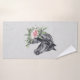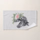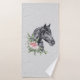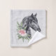 Toalla con un hermoso ilustracion de cabeza de caballo negra con un lujoso adorno floral en el cuello. Elegante y elegante pintura de animales. Fondo moteado gris.