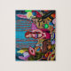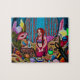 Un rompecabezas perfecto para inspirar a cualquier artista, ya sea a orillas de la playa o no. Esta hermosa imagen representa a una sirena buscando inspiración en su estudio/cueva de arte. Principalmente usaba marcadores de cobre y lápices de colores para colorear la pieza original, pero para los cristales más cercanos a la entrada de la cueva, usaba pasteles de tiza.