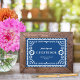 Este elegante y moderno papel papel, símbolo de la recepción de boda, presenta un hermoso marco ornamentado en blanco, un fondo azul colorido y una tipografía festiva. Personalizar esta plantilla como un signo de mesa para favores, libro de visitas, menú, buffet, etc. El tamaño predeterminado es de 5" x 7", lo que se adapta perfectamente a un marco fotográfico de tamaño estándar que se puede colocar sobre una mesa. Este elegante y moderno diseño es una fabulosa elección para una boda de boda o destino en México. Todo el texto es personalizable, sólo tienes que hacer clic en el botón "personalizar" del texto. Vea la colección para más piezas coordinadas!