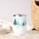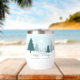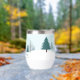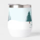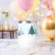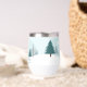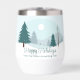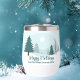 Un hermoso paisaje invernal con verde azulados pinos verdes y terreno cubierto de nieve en un regalo personalizado de vaso de vino de vacaciones. Personalizar los regalos de feliz día festivo de esta empresa para sus clientes corporativos o empleados.