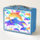 Abróchese el día escolar de su niñita con estos delfines de la lonchera alegres y coloridos. Los delfines están en un arco iris de colores: azul, verde, amarillo, rojo y morado. Complete la apariencia del personalizado con un nombre. Esta caja de almuerzo hace un hermoso regalo personalizado de regreso a la escuela, cumpleaños, Navidades u otro regalo de vacaciones!