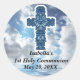 Una cruz azul decorativa en una fotografía original de cielos azules y nubes blancas que brillan sobre el agua reflejada debajo es un lindo placer recordar este día sagrado especial. El texto de "Nombre de la primera comunión sagrada" que aparece con la fecha es fácilmente personalizado. Estos pegatinas especiales, únicos y inspiradores también hacen grandes favores partidarios. Niza también para confirmaciones, un bautismo / bautizo, un boda, para Pascua, y inspirador para cualquier evento religioso especial.