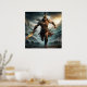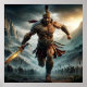 Un guerrero muscular vestido con armadura de bronce corre hacia delante con una espada de oro, llevando a un ejército a través de un paisaje montañoso. La escena está puesta contra un cielo dramático, capturando la intensidad y el valor de batallas antiguas