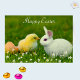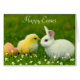 Hermoso conejito blanco de Pascua con pollo y flores Happy Easter Card. El texto puede ser personalizado para Semana Santa o Cumpleaños.