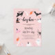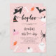 Cute tema de halloween chica carta de invitación de cumpleaños con ilustracion de un fantasma, gato negro, araña, murciélago, caramelos y calabazas. El texto dice "hey boo".