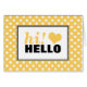Elegante, todas las ocasiones tarjetas de felicitación con puntos de polka blanco sobre amarillo, y el saludo "hi! HOLA". El interior puede ser personalizado con su propio mensaje personalizado o puede ser borrado fácilmente para dejar la tarjeta en blanco para escribir a mano su mensaje. Sin orden mínima. Existen descuentos masivos. Hay otros colores disponibles. ¡Mezcla y Coincidencia!