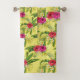 Un conjunto de toallas de baño con flores de hibisco tropicales de color amarillo brillante con tonos de rosa