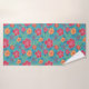 Flores de hibiscos florales coloridas en rosa y naranja con hojas verdes, patrón de inspiración hawaiana sobre un fondo azul.