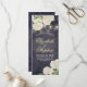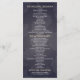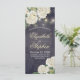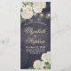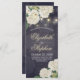 Plantillas de tarjetas para rack del programa de bodas - Flores de hidrangea blanca y luces de cadena en fondo de línea azul de la marina de época. Un diseño perfecto para tu gran día. ¡Todo el estilo de texto, colores, tamaños se pueden modificar para adaptarlo a sus necesidades!