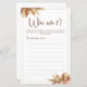 Abraza el encanto rústico del otoño con nuestra Tarjeta de juego Quién Soy Yo de Hierba seca de Pampas, perfecta para despedidas de soltera boho y reuniones temáticas. Adornada con acentos dorados, esta tarjeta caprichosa captura la esencia de la elegancia bohemia, añadiendo un toque de belleza natural a cualquier evento. Deja que los tonos suaves y apagados de la hierba de pampas marquen el tono para un divertido juego de adivinanzas que encantará a los invitados y creará recuerdos inolvidables.