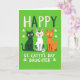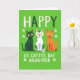 Esta tarjeta presenta tres gatos estilizados alineados al frente y al centro sobre un fondo verde lima brillante, dando a toda la escena un aspecto festivo del Día de San Patricio 💚. Un gato es verde esmeralda, el siguiente es blanco con manchas verdes que parecen tréboles, y el tercero es un atigrado rojizo, todos sentados ordenadamente uno al lado del otro como si estuvieran posando juntos. Sus ojos amarillos y narices rosadas diminutas añaden un encanto seductor, y los pequeños colmillos blancos que asoman hacen que parezcan compartir una broma interna con el espectador. La mirada fija y frontal de los gatos se siente como un codazo amistoso destinado solo a una hija, con la estrecha proximidad del trío sugiriendo un vínculo acogedor y afectuoso. En la parte superior, "FELIZ" está escrito en letras alternadas de color verde oscuro y blanco, espaciadas uniformemente sobre sus cabezas. A lo largo de la parte inferior, "DÍA DE SAN GATITO HIJA" aparece en texto blanco grande, centrado y fácil de leer, con pequeños tréboles blancos flotando alrededor ☘️. El