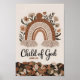 Una ilustración de un arcoíris de estilo boho con tonos neutros. El arcoíris está hecho de tela y está colgado al aire libre. Hay flores de varios colores alrededor del arcoíris. El suelo está cubierto de hojas. El texto "Hijo de Dios" está escrito debajo del arcoíris en letra cursiva.