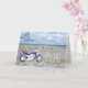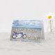 Una moto azul que se coloca en una playa con las nubes mullidas en el cielo. El feliz cumpleaños escrito en roca reflejó en el agua que mentía en la arena.