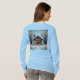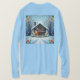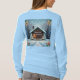Esta es una casa de mangas largas de color azul claro para las camisetas de vacaciones. El diseño de los Navidades fue creado con arte generativo. El arte cuenta con una cabina sobre un fondo de copos de nieve azul claro. Las palabras Home For The Holidays se centran en la imagen. Hay flores en las esquinas. El diseño del Home For The Holidays está en la parte delantera y trasera de la camiseta.
