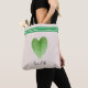 La forma de la hoja de corazón verde, fina y elegante, se encuentra en la bolsa de la tota beige. Bolso de mano para damas, bolsa para comestibles, bolsa de playa, bolsa para la ropa de la tote. Bolsa beige y verde moderna.