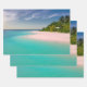 Wrapping paper sheets with a beautiful photograph. A scenic tropical beach with aquamarine water and a white sandy beach with a lush forest in the back. A solitary umbrella available for those who love seclusion.