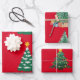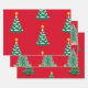 Árboles de Navidad rojos envolviendo hojas de papel con 3 diseños. Este conjunto de sábanas de papel de envoltura incluye árboles de Navidad con nieve, regalos y decoraciones.