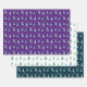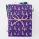 Conjunto de Navidades verdes, morados y blancos envueltos en papeles, adornado con un patrón repetido de árboles verdes minimalistas y estrellas delicadas.