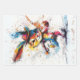 "Los Vibrantes Voyagers" Este ilustracion vibrante y estilizado presenta una ardilla y un conejo en movimiento intermedio, con salpicaduras dinámicas de pintura y tinta que sugieren movimiento. La ardilla lleva un gorro rojo hacia atrás, añadiendo una característica divertida, de tipo humano. El uso de colores vivos y estilo abstracto hace que la imagen sea visualmente llamativa y enérgica, capturando el espíritu vivo de la ardilla