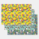 Presenta tres hojas diferentes de papel de envoltura con motivos de pastor australiano. Los australianos con sus coloridos globos fiestas sobre un fondo amarillo brillante, un collage de australianos sobre un fondo verde menta y un diseño tropical con aromas y hojas de monstera verde sobre un fondo azul real.