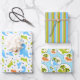 Este conjunto de papeles de envoltura contiene tres lindos dinosaurios con rayas coordinadas, polkadots y palmeras. Los dinosaurios son considerados personalizados amigables y juguetones apropiados para los niños pequeños. Hay un brontosauro azul con polkadots azul claro, un rex de tiranosaurio verde con polkadots amarillos y un triceratops naranja con polkadots azul claro. El conjunto incluye una hoja con dinosaurios y polkadots, una hoja con rayas verticales y una hoja con dinosaurios y palmeras.