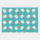 Conjunto de tres hojas de papel de envoltura con patrones de Navidades de playa. Los dólares de arena blanca y las estrellas del mar marrón forman una forma de corona que forma un patrón de diferentes tamaños sobre el papel en tonos azules. Los colores acuático, turquesa y azul marino se enrollan para que el papel no se pliegue.
