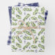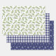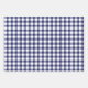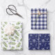 sábanas de papel de envolvimiento de vacaciones en azul y blanco con tres patrones a juego: ramas verdes con flores blancas y bayas azules, gingham azul y copos de nieve blancos contra el azul oscuro.