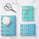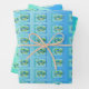 Este conjunto de sábanas de papel envolvente tienen una imagen repetida de un dragón tipo caballito de mar de fantasía con cuernos azules y verdes con su cola envuelta en algas en un marco verde a azul con burbujas de agua flotante. Las tres sábanas están decoradas en diferentes tonos de azul y verde.
