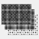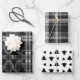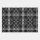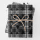 Pine trees and black plaid wrapping paper sheets. Christmas in black, white and gray. Three sheets of high quality gift wrap with three different designs. Black trees with swirling branches over a black and gray plaid background for one, with only trees, and only plaid for the others.