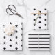 Papel de envoltura geométrico moderno en blanco y negro en hojas minimalistas en 3 diseños: estrellas, puntos y rayas. Regalo de regalo ideal para un cumpleaños.
